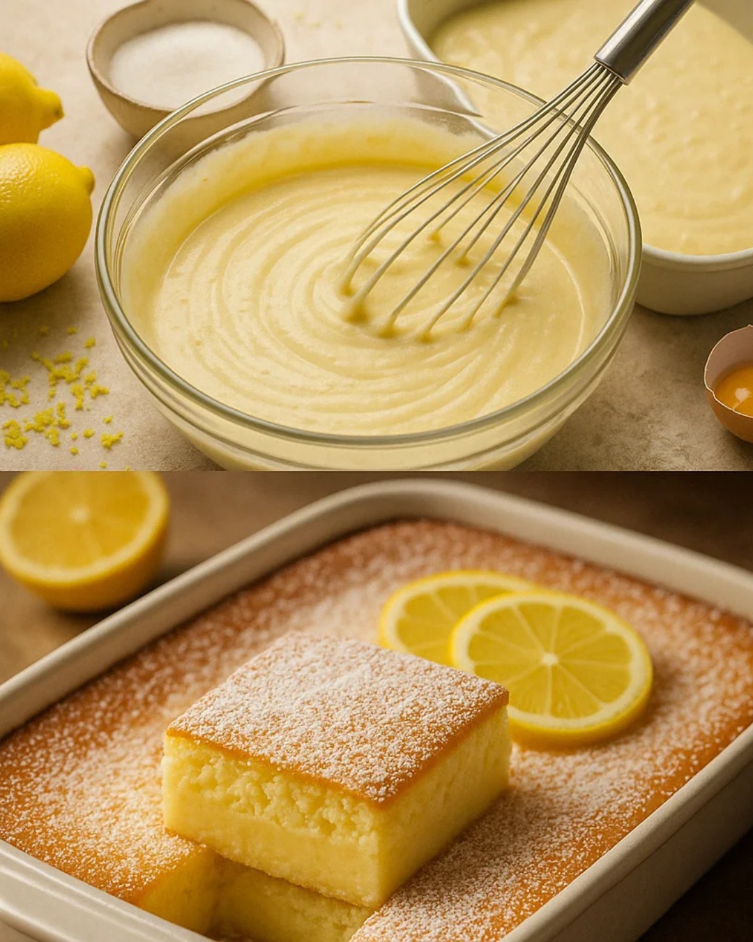 4 Eier (Eigelb und Eiweiß getrennt) 150 g Zucker 1 Päckchen Vanillezucker 120 g geschmolzene Butter 115 g Mehl Der Saft von 2 Zitronen + fein abgeriebene Schale 500 ml heiße Milch Eine Prise Salz Puderzucker zum Bestreuen