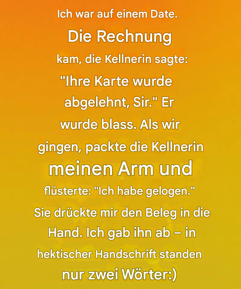 Während ich auf einem Date war, kam die Rechnung, und die Kellnerin sagte: „Mein Herr, Ihre Karte wurde abgelehnt.“