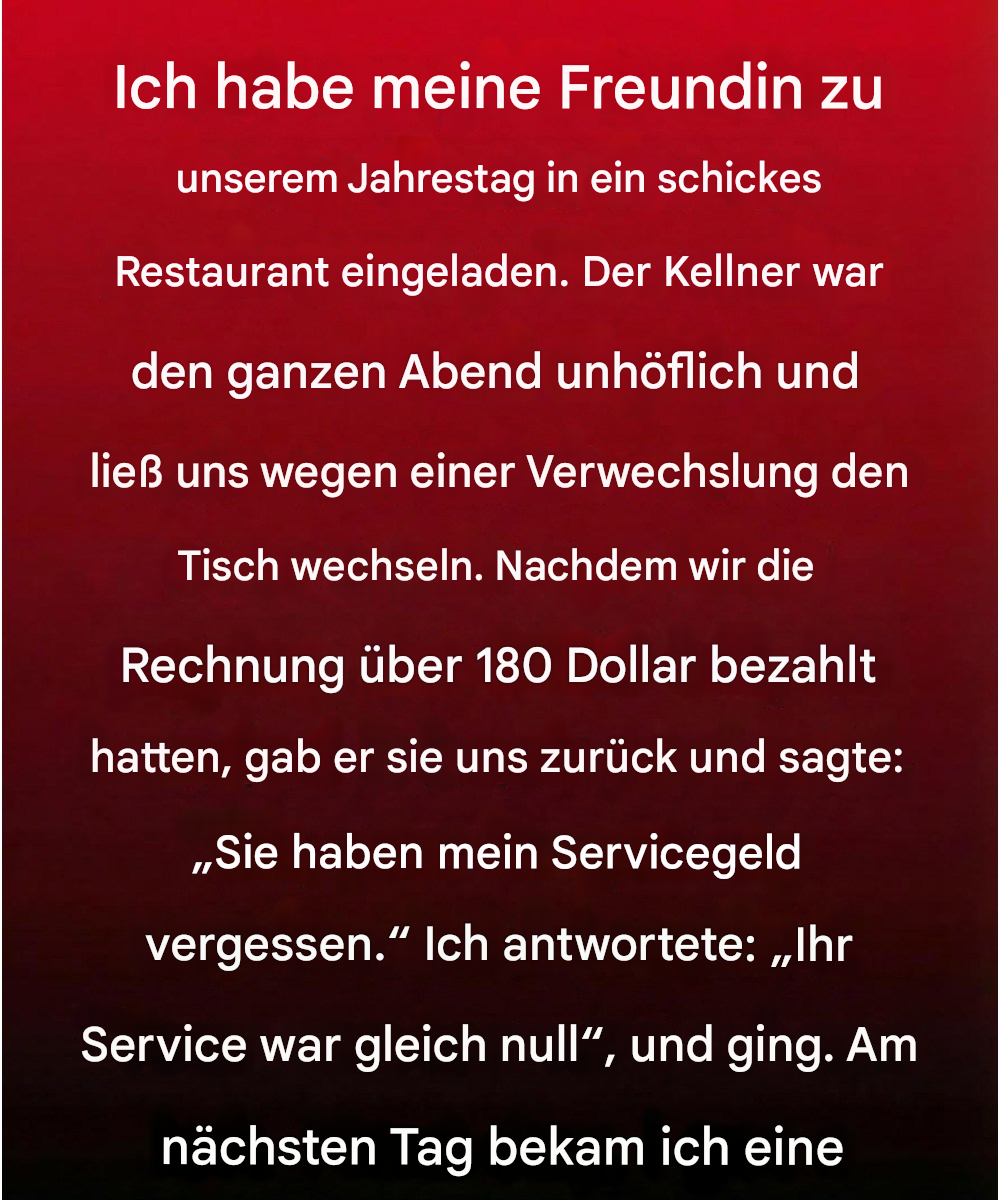 Dieser Abend sollte etwas Besonderes werden – so ein Abend, den man sorgfältig plant und von dem man hofft, dass er einem noch lange in Erinnerung bleibt. Ich hatte wochenlang gespart, Gespräche in Gedanken durchgespielt und ein Restaurant ausgesucht, das für seine unaufdringliche Eleganz bekannt war. Sanftes Licht, frische Tischwäsche, polierte Gläser – alles versprach Intimität und Geborgenheit. Als meine Freundin lächelnd und strahlend ankam, glaubte ich fest daran, dass der Abend genau so werden würde, wie ich ihn mir vorgestellt hatte.