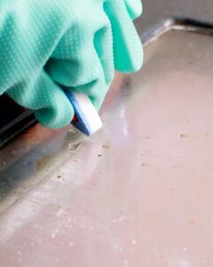 Nehmen Sie einfach die Tablette, tauchen Sie sie in eine Schüssel mit heißem Wasser und schrubben Sie damit das Ofenglas. Sie können das Tablet auch auf dem unglasierten Teil der Backofentür verwenden. Nach ein paar Reibungen werden Sie bemerken, dass sich Fett und Schmutz lösen. Möglicherweise müssen Sie mehrere Tabletten verwenden, um die Reinigung abzuschließen, da diese mit der Zeit zu zerbröckeln beginnen und sich auflösen.